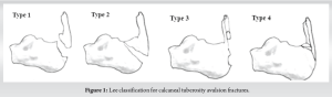Age 18 years or older, acute open or closed, extreme beak calcaneal fracture: Type 2 Lee’s tuberosity avulsion fractures, displacement of more than 1 cm.