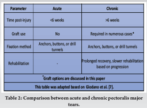 At present, pectoralis injury tears are increasingly classified depending on their chronicity, which considerably influences their therapeutic management. Nevertheless, it must be stressed that the definition of chronic tears remains ambiguous across the scientific literature. In the current review, we have defined chronic tears in line with the recently CiSE-published paper by Giordano et al. [7] According to their and our definition, chronic tears correspond to injuries presenting at least 6 weeks following the initial traumatic event (Table 2).