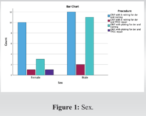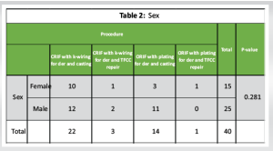 As per Table 2 and Fig. 2, there were 10 females and 12 males for CRIF with k-wiring for der and casting, 1 female and 2 males for CRIF with k-wiring for der and TFCC repair, 3 females and 11 males for ORIF with plating for der and casting, and 1 female for ORIF with plating for der and TFCC repair. As per Chi-square, there was no significant association between sex and procedure (P > 0.05).