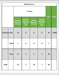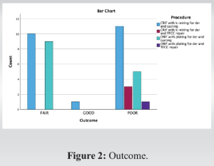 As per Table 10, out of 19 patients who had fair outcome, 10 had CRIF with k-wiring for der and casting and 9 had ORIF with plating for der and casting. Further, out of 20 patients who had poor outcome, 11 had CRIF with k-wiring for der and casting and 14 had ORIF with plating for der and casting. Further, as per ANOVA, there was no significant association between outcome and procedure (P > 0.05).