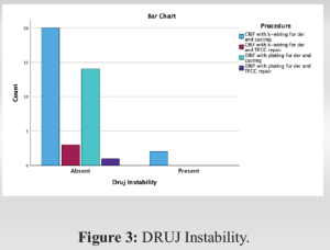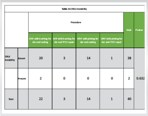 As per Table 11, out of 38 patients in which DRUJ instability was absent, 20 had CRIF with k-wiring for der and casting and 14 had ORIF with plating for der and casting. Further, out of 2 patients in which DRUJ Instability was present, 2 had CRIF with k-wiring for der and casting. Further, as per ANOVA, there was no significant association between DRUJ Instability and procedure (p>.05).