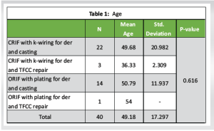 According to Table 1 and Fig. 1, the mean age of CRIF with k-wiring for der and casting patients was 49.18 years (SD = 17.29), the mean age of CRIF with k-wiring for der and TFCC repair patients was 36.33 years (SD = 2.30), the mean age of ORIF with plating for der and casting patients was 50.79 years (SD = 11.93), and the mean age of ORIF with plating for der and TFCC repair patients was 54.0 years. As per ANOVA, there was no significant difference in age between groups (P > 0.05).
