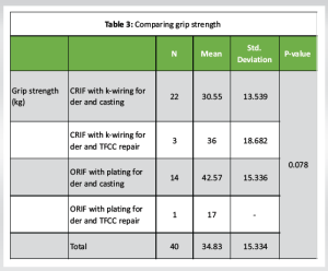 As per Table 3 and Fig. 3, patients with ORIF with plating for der and casting had the highest grip strength (kg) (42.57 ± 15.33), whereas patients with ORIF with plating for der and TFCC repair had the lowest grip strength (kg) (17.0). As per ANOVA, there was no significant difference in grip strength between the groups (P > 0.05).