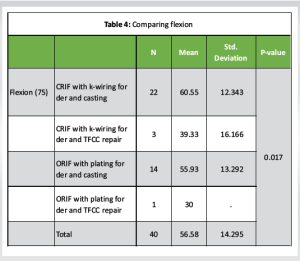 As per Table 4, patients with CRIF with k-wiring for der and casting had the highest flexion (75) (60.55 ± 12.34), whereas patients with ORIF with plating for der and TFCC repair had the lowest flexion (75) (30.0). As per ANOVA, there was a significant difference in flexion between the groups (P < 0.05).