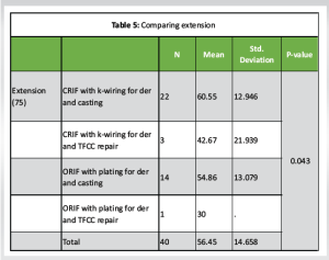 As per Table 5, patients with CRIF with k-wiring for der and casting had the highest extension (75) (60.55 ± 12.94), whereas patients with ORIF with plating for der and TFCC repair had the lowest extension (75) (30.0). As per ANOVA, there was a significant difference in extension between the groups (P < 0.05).
