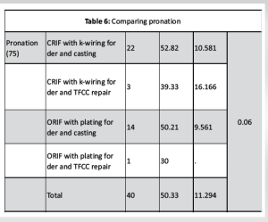 As per Table 6, patients with CRIF with k-wiring for der and casting had the highest pronation (75) (52.82 ± 10.58), whereas patients with ORIF with plating for der and TFCC repair had the lowest pronation (75) (30.0). As per ANOVA, there was no significant difference in pronation between the groups (P > 0.05).