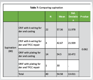 As per Table 7, patients with CRIF with k-wiring for der and casting had the highest supination (80) (57.36 ± 11.97), whereas patients with ORIF with plating for der and TFCC repair had the lowest supination (80) (30.0). As per ANOVA, there was no significant difference in supination between the groups (P > 0.05).