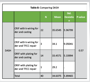 As per Table 8, patients with CRIF with k-wiring for der and casting had the highest DASH score (35.65 ± 5.96), whereas patients with ORIF with plating for der and TFCC repair had the lowest DASH score (29.20). As per ANOVA, there was no significant difference in DASH score between the groups (P > 0.05).