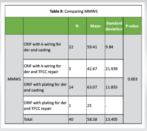 As per Table 9, patients with ORIF with plating for der and casting had the highest MMWS (63.07 ± 11.85), whereas patients with ORIF with plating for der and TFCC repair had the lowest MMWS (25.00). As per ANOVA, there was a significant difference in MMWS between the groups (P < 0.05).