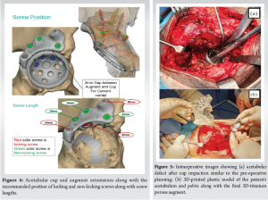 Case Report: This retrospective case series includes seven patients who underwent revision THA for Paprosky grade 3 acetabular bone loss between January 2023 and April 2024 at two high-volume tertiary care centers. The mean age of the patients was 45 years, with three males and four females included in the study. Pre-operative planning involved advanced imaging techniques, including 3D-computed tomography scans and custom virtual modeling, to design the acetabular components tailored to each patient’s specific anatomical requirements. During the surgeries, custom-made 3D-printed titanium augments and cages were used. These implants were fabricated using in-house software, and the turnaround time from the decision to surgery was approximately 10 days. Post-operatively, the planned 3D model was superimposed on post-operative radiographs to assess implant placement accuracy. The Harris hip score at the final follow-up averaged 69.16, with no signs of implant loosening observed.