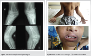 A 12-year-old male patient presented to our hospital with complaints of bilateral bowing of legs and difficulty walking. On local examination, he had complaints of knock knees with bilateral genu valgum. Following this, a detailed history and general examination were conducted. He was the second child of a consanguineous marriage of healthy and normally developed parents following a normal delivery. The parents’ first child had died at the age of 3 years with some cardiac abnormalities, of which details were unknown. The patient had mild neurodevelopmental delay. History also revealed that he had undergone atrial septation with a tanned pericardial patch for a common atrium at the age of 4 years. On examination, the patient had stunted growth with a long trunk and short limbs. In the upper limb, the arm was disproportionately short with respect to the forearm, while in the lower limbs, the legs were disproportionately short compared to the thighs. He had bilateral polydactyly on his hands with dysplasia of nails (Fig. 1). There was a deformity in the knees with bilateral genu valgum (Fig. 2 and 3). In the elbows, there was bilateral cubitus valgum (Fig. 4a). Intraoral examination showed teeth malformation of his upper and lower jaw with fusion of the upper lip with maxillary gingival mucosa and the lower lip with mandibular gingival mucosa (Fig. 4b). Systemic examination revealed all systems to be normal. A clinical diagnosis of EVC syndrome was made.