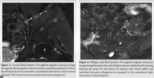 A 72-year-old male with a past medical history of a right knee medial meniscal tear and chondromalacia, type 2 diabetes mellitus, coronary artery disease status post placement of two right coronary artery stents, hypertension, and hyperlipidemia presented to his PCP for evaluation of persistent acute left knee pain. He reported that 5 weeks prior he had slipped getting out of his hot tub. He described a sudden split motion with extreme hyperextension of the left hip with hyperflexion of the right hip. After, he experienced sudden bilateral knee pain predominantly in the left knee with no associated edema or bruising. The pain in the right knee resolved without treatment. His chief complaint was an inability to extend his knee or lift his leg, which unfortunately caused him to fall 4 days before the visit. Otherwise, he was in his normal state of health. On examination, he was noted to have tenderness to the proximal medial collateral ligament, iliotibial band, patella tendon, and quadricep tendon. There was no swelling or deformity and he demonstrated full range of motion. Motor testing demonstrated 1/5 strength to left knee extension and hip flexion. A quadriceps rupture was suspected. Referrals were placed for a left knee magnetic resonance imaging (MRI) and a consultation with the orthopedic department for further evaluation. The patient was then seen in the orthopedic clinic the following week. He reported continued left knee pain and weakness. The examination revealed no ligamentous injury. There was no defect to the quadricep tendon but there was noticeable quadricep atrophy. A neurologic examination showed numbness to the medial aspect of the knee, and he demonstrated an inability to fire the quadriceps. He also described burning pain radiating down the front of his leg. Radiographs of the left knee showed no acute process, specifically no patella baja or alta. MRI of the knee showed no evidence of a quadricep rupture. The MRI did show chronic degenerative changes in the knee. After imaging review and evaluation, femoral nerve palsy was suspected. The patient was sent for an electromyography (EMG) and an MRI of the femur to assess the femoral nerve’s continuity. He was also referred to physical therapy for quadriceps strengthening. Gabapentin therapy was started to help with continued pain. The EMG and femur MRI were completed the following day. The EMG showed an active and severe left L3 lumbar radiculopathy. The MRI showed no signs of injury to the left thigh nerves. After these findings were reviewed an MRI of the lumbar spine was placed. The MRI of the lumbar spine was completed the following week. This showed multilevel degenerative changes, spinal canal narrowing, and bilateral neuroforaminal narrowing at L4-L5. This prompted an order for a lumbar plexus MRI to be completed the next day. This demonstrated injury to the pelvic portion of the femoral nerve with mild enlargement and higher-than-normal signal intensity. MRI Fig. 1 and 2 show L3/L4 fascicular enlargement consistent with femoral nerve injury.