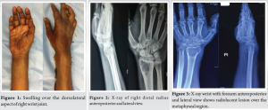 A 44-year-old male presented with complaints of right wrist pain and swelling (Fig. 1) for the past 3 months. He was apparently normal before 3 months. After he developed pain over the right lower forearm which was insidious in onset, non-progressive in nature, dull aching type, non-radiating, aggravated by movements and work relieved by medications. There was no past, family history of note and he was taking no regular medications. On examination of right wrist, diffuse swelling was present just proximal to wrist crease. Tenderness and bony thickening were present over the distal radius.