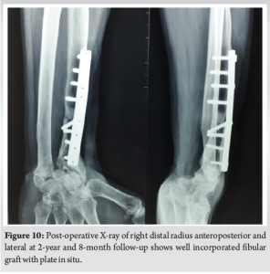 At 2 year and 8 months of follow-up, the patient had (Fig. 9) wrist palmar flexion of 30°, pronation of 70°, supination of 20°, dorsiflexion is NIL. The fibular graft was shorter in comparison to the length of ulna. Probably, if we had taken a longer fibular graft, range of movements may have been better as ulno-carpal impingement could have been avoided. X-ray showed that the fibular graft had well incorporated (Fig. 10).
