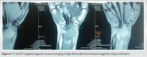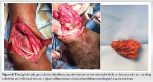 Magnetic resonance imaging of right wrist joint (Fig. 4) shows diffuse aggressive expansile heterogenous lytic lesion with articular extension in the distal end of radius of length 3.8 cm involving the epiphyseal and meta-diaphyseal region with narrow zone of transition with cortical breach in the anterior and posterior aspect of lesion with extraosseous anterior and posterior projections. Initially, core needle biopsy of right distal radius lesion at its proximal margin from the dorsal side was done and diagnosis of GCT of right distal radius was confirmed. After that the patient was planned for definitive management.