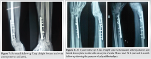 Longitudinal wide excision of right distal radius GCT was planned in view of cortical breach and soft tissue extension. Under general anesthesia, in supine position, incision was made over the dorsal aspect of wrist and forearm. The tumor capsule was identified. Under image intensifier guidance, distal radius was osteotomized. 6.5 cms proximal to distal radius articular surface to give 3 cm of tumor clearance. Using bone holder, the tumor segment with segment of 3 cm of normal bone given for clearance was lifted up (Fig. 5). Care was taken to dissect around the tumor without breaching the tumor. The ligaments of radiocarpal and radioulnar joint were divided and the tumor was delivered out/excised. Proximal fibular autograft including the fibular head was harvested from the ipsilateral right side through the posterolateral approach after isolating the common peroneal nerve. The length of the autograft harvested was around 7 cms. The distal end of this graft was stabilized to the radius with a 3.5 mm Asian dynamic compression plate and screws. Hence, the fibular head resembled and replaced the distal radius. The fibular head was stabilized with two 2 mm Kirschner wires – one fixing it to the carpus and another to the distal ulna (Fig. 6). The patient was maintained on an above elbow slab for 3 weeks and below elbow slab for further 3 weeks. The K-wires and splintage were removed after 6 weeks after which gradual mobilization of wrist and forearm was allowed. The patient was followed up at 3 months, 4 months, 6 months (Fig. 7), and 1 year (Fig. 8) and yearly once after, fibular graft was well united even at 6-month follow-up.