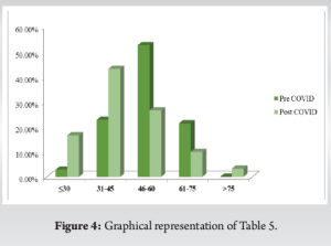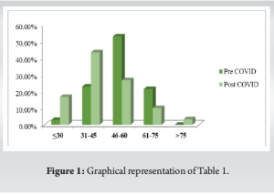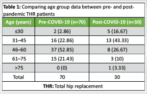 The data collected were entered into an excel sheet and analyzed using SPSS version 25.0. Qualitative variables were expressed as frequencies (percentages) and quantitative variables as mean ± standard deviation or median (interquartile range [IQR]). Our analysis shows that the number of patients requiring THA post-pandemic is more among the age group of 31–40 years; while pre-pandemic it is the age group of 46–60 contributing the highest (Table 1 and Fig. 1).