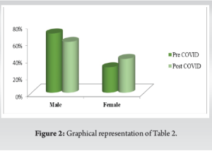 We found that the ratio of male to female requiring THA pre-pandemic was 7:3, while post-pandemic it is 3:2, as there is a mild increase in females undergoing THA (Table 2 and Fig. 2).