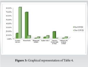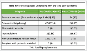 With regards to the multiple diagnoses requiring THA, we have realized that it was primary osteoarthritis the maximum before the pandemic, whereas post-pandemic almost 80% were diagnosed to have femoral head AVN (FHAVN) (Table 4 and Fig. 3).