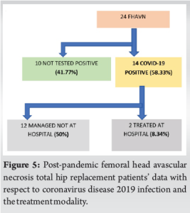 Out of 24 patients in post-pandemic group, with Stage 3 and 4 FHAVN, 14 patients (58.33%) were tested COVID-19 positive, of which 2 patients (8.34%) were hospitalized and conservatively treated (further information not available), 12 patients (50%) had a history of medication as per physician advice, but whether it was corticosteroid, information was not available and 10 patients (41.66%) had no history of COVID-19 infection (Fig. 5).