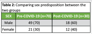 The sample size was 30 in each group Group I- pre-COVID 70 cases considered and Group II – post-COVID 30 cases considered). Using the sample size formula, with prevalence of 0.00019 with 3% margin of error, minimum number to conduct this study was too small, hence sample size of 30 considered.