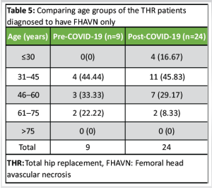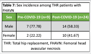 Furthermore, there is an increment in females with FHAVN undergoing THA post-pandemic (Table 7).