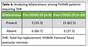 On an attempt to analyze the bilateral presentation of FHAVN requiring THA, results show that it has drastically increased post-pandemic, such that the ratio has almost inversed (Table 6).