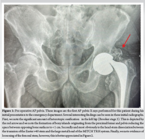 Primary total hip arthroplasties (THA) are one of the most common elective procedures being performed by orthopedic surgeons worldwide with over 200,000 being performed yearly in the United States of America alone [1,2]. High success rates and an aging global population have made this one of the fastest growing procedures in the USA with a projected increase of up to 70% from 2014–2030 [3]. The goal THA is to restore the normal hip joint anatomy and ultimately, alleviate patient’s symptoms. Despite the success rates, failure can occur due to various reasons including hip instability, prosthetic joint infection, implant loosening, and implant failure or wear. Recently, modular THA systems have fallen into favor due to their ability to allow the surgeon to make fine adjustments in order restore the natural biomechanics of the hip joint as closely as possible [4]. Over the years, the design of the THA has undergone significant changes with different materials trialled to reduce the risk of implant wear and instability. Materials including stainless steel, titanium alloys, zirconia, cobalt chrome alloys, ultra high molecular weight polyethylene have been utilized with configurations such a metal-on-metal (MoM), metal-on-polyethylene (MoP), ceramic-on-polyethylene (CoPE), ceramic-on-ceramic (CoC) ceramic-on-metal (CoM) being possible [5]. The MoM configuration had high hopes of resolving some of the issues associated with THA including polythene wear while providing greater joint range of motion and stability with large diameter heads [6]. Unfortunately, significant serious complications were noted with these configurations including metallosis, trunnionosis, metal ion toxicity and pseudotumor formation. Some studies reported failure rates of up to 30% at 7 years [7]. The MITCH TRH modular system was a popular system for THA and was utilized worldwide between 2006 and 2011. Unfortunately, there were early reports of failure and thus the system was recalled discontinued in 2012. Trunnion failure, head-neck dissociation, and fretting were seen, especially in the Accolade I TMZF uncemented stems when used in combination with the MITCH TRH modular head [8]. From our review of the literature, there has not yet been a reported failure of the popular Exeter V40 cemented femoral stem in this fashion. While stem fractures have been reported [9], fretting and corrosion of the trunnion with associated head-stem dissociation in a MoM hip has yet to be reported until now.