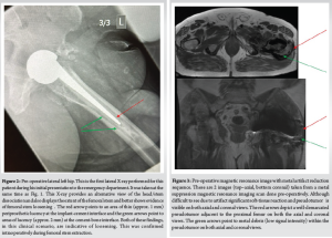 A 76 year old with a BMI of 36 kg/m2 male presented to the Emergency Department with left-sided hip pain and discomfort after performing a “twisting” motion of his hip while getting into bed. He described a “popping” sensation in his left hip upon doing this movement and immediately experienced a sharp pain and was unable to weight bear on that side. The patient described a discomfort in that left hip for the last 4 weeks before this acute presentation, which was not triggered by any trauma/injury. This patient had a MoM THA that was performed 16 years ago for osteoarthritis. He had had a successful outcome until now and denied any post-operative complications after the procedure. The MITCH TRH Modular head with an Exeter V40 cemented stem was used and the operation performed by an experienced consultant orthopedic surgeon. The patient’s medical history includes atrial fibrillation, coronary stenting, high BMI (36 kg/m2) hypertension, hypercholesterolemia, and bilateral total knee replacements. The patient is a non-smoker with occasional alcohol intake and mobilizes independently without walking aids at baseline. Clinical examination at the presentation revealed a shortened limb on the left side held in the neutral position. The patient was unable to straight leg raise due to pain and had a normal neurological and vascular examination. No visible signs of injury or trauma were present, and a systems examination was normal. The patient was admitted under the care of the orthopedic team, and investigations, including X-rays, MARS scan, laboratory tests (Full blood count, renal profile, C-reactive protein, coagulation profile, metal ion levels), and electrocardiogram, were ordered. X-rays (Figs. 1 and 2) revealed head-stem dissociation in a MoM hip configuration. Blood investigations were within normal levels and without any evidence of infection. Of note, metal ion levels are still in process. A MARS scan was conducted which revealed a subfascial 7cm × 7 cm × 10 cm collection posterior to the THA (Fig. 3.)