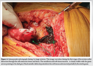 This case was discussed at the orthopedic department trauma MDT and a revision hip arthroplasty surgeon took lead on the case. Initially, a full revision of all components was planned in a one-stage fashion, however, the extent of metallosis noted intraoperatively prompted a change in plan to a 2-stage style revision with early implantation of final components on the condition of negative culture swabs from the affected hip.