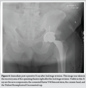 The surgical wound was closed in layers in a standard fashion with PDS sutures and skin clips. Following a confirmation of negative tissue samples and cultures swabs from the microbiology laboratories, opinion was sought from the infectious diseases team regarding 2nd stage revision. Given that the patient had negative culture swabs and pre-operative inflammatory markers were normal, decision was made to proceed with early 2nd stage revision 1 week after the 1st stage procedure. The same surgical incision was used to regain access to the hip joint. The cement spacer was removed and the final components (cemented Exeter v40 stem size 1 with 50 mm offset, 36 mm standard ceramic head, 58 mm Trident Hemispherical Uncemented cup with 36 mm 10° eccentric insert) were implanted (Fig. 6). The hip was stable in all ranges of motion, and leg lengths were equal. The surgical wound was closed again in a similar fashion to the 1st stage procedure with PDS sutures and skin clips.
