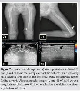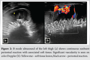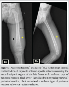 Thigh swelling is a common complaint in children. The onset and progression of swelling, history of fever, and pain must be assessed. Differentials to be considered include infective/inflammatory causes such as osteomyelitis, metastatic neuroblastoma, primary bone tumors such as Ewing’s sarcoma, osteosarcoma, and soft-tissue tumors such as angiosarcoma, synovial sarcoma, malignant melanoma, melanotic neuroectodermal tumors of infancy, granulocytic sarcoma, and malignant lymphoma. High CRP and LDH levels and moderate anemia suggest malignancy more than infection. In children <5 years old, osteosarcoma and Ewing’s sarcoma are primarily considered. Other rare tumors such as neuroblastoma and Wilms tumor need to be considered in under 5 children [3]. A suggested imaging protocol for the child presenting with a soft-tissue mass following clinical assessment is a plain radiograph and USG examination with color Doppler to assess a lesion’s vascularity. In many instances, a firm or provisional diagnosis is possible with these investigations. If the diagnosis is unclear from these investigations, then magnetic resonance imaging (MRI) or computed tomography (CT) are indicated. The full extent of any lesion may require an MRI or CT to demonstrate the anatomical relationships for surgical planning. An expansile lytic lesion with a periosteal reaction involving diaphysis of long bones is commonly thought of in terms of Ewing’s sarcoma and osteomyelitis [4]. Even metastasis from common pediatric tumors such as neuroblastoma should also be considered in such cases. The presence of soft-tissue mass and interrupted type of periosteal reaction favors neoplastic etiology more than osteomyelitis. Soft-tissue components are better interpreted on high-resolution USG. If the USG examination is not conclusive or cannot completely assess the lesion, MRI is often used as a second-line imaging modality [5]. Ewing sarcoma is the second most common primary malignant bone tumor in children and adolescents, representing about 3% of all pediatric cancers. It predominantly affects individuals between the ages of 4 and 25, with a peak prevalence between 10 and 15 years. There is a slight male predilection, and it is more prevalent in white patients [6]. Clinical presentation typically involves pain, mass, or swelling, with symptoms persisting for over 6 months before diagnosis. Fever and increased erythrocyte sedimentation rate are also observed in a significant number of patients. The most commonly affected sites are the femur, ilium, tibia, humerus, fibula, ribs, and sacrum. Radiographs frequently reveal a diaphyseal lesion in the diaphyseal region with onion skin periosteal reaction [7]. Neuroblastoma, ganglioneuroblastoma, and ganglioneuroma are a spectrum of tumors arising from neural crest cells or primitive sympathetic ganglion cells. Overall, approximately 46% of them arise from adrenals and 18% from extraadrenal abdominal locations 14% from the posterior mediastinum, and the rest from neck/pelvis/other locations. It accounts for 15% of the fatalities due to its aggressive nature and metastatic disease at presentation. Approximately 41% of neuroblastoma cases are detected within the first 3 months of life, and the median age at diagnosis is 19 months. The prognosis of neuroblastoma is influenced by age, with children under 1 year old having a significantly higher 5-year survival rate compared to those diagnosed later. There are racial and ethnic disparities in both the risk and survival rates of children with neuroblastoma [8]. Neuroblastoma is commonly intra-abdominal location with lung invasion through lymphatic circulation and bone marrow, bone, skin, and liver via hematogenous circulation. Diffuse bone marrow and bone involvement can cause claudication, pain, discomfort, pathological fracture, and cytopenia. Imaging modalities ranging from radiographs to PET and bone scans are used for complete evaluation, staging, and management accordingly. The prognosis depends on the age of the patient at diagnosis. Primary involvement of the musculoskeletal system occurs only in 15% of neuroblastoma cases [9]. Small round blue cell tumors reported in histopathology reports are seen in neuroblastoma, Ewing’s sarcoma, rhabdomyosarcoma, non-Hodgkin lymphoma, and primitive neuro-ectodermal tumors [10]. In our case, the primary presentation was a mass involving the left femur which mimicked Ewing’s sarcoma on X-ray; however, on abdominal USG, and CECT abdomen, an imaging diagnosis of neuroblastoma with bony metastasis was made, which was confirmed on histopathology.