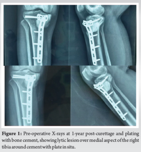 A 28-year-old female, previously treated for GCTB of the right proximal tibia with curettage, cementing, and plate stabilization in 2020, presented to our outpatient department with complaints of pain in right leg while walking since October 2021. There was no history of trauma and no associated fever, weight loss, or other constitutional symptoms. Local examination revealed tenderness over the anteromedial aspect of the proximal tibia with a local rise in temperature and a single healed previous surgical scar with no discharge, accompanied by painful terminal restriction of knee range of motion. Plain radiography of right knee was suggestive of lytic lesion over medial aspect of the right tibia around cement with plate in situ and magnetic resonance imaging (MRI) right knee was suggestive of recurrence of the tumor with no breach in joint line and no involvement of neurovascular structures (Fig. 1).