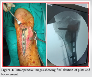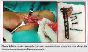The patient underwent implant removal with debridement, extended curettage, cementing, and plate stabilization. Intraoperatively, dirty granulation tissue was observed around the plate, along with brownish tumor tissue around the cement mantle extending laterally, proximally, and distally (Fig. 2). Tissue samples were collected for bacterial culture sensitivity and histopathological analysis (Fig. 3). Debridement and removal of tumor tissue were performed using bone curettes, followed by chemical curettage with 70% phenol. The remnant cavity was then filled with gel foam, bone cement mixed with 4 g of vancomycin and 160 mg of gentamycin and later stabilized with a 4.5 locking T-buttress plate on the anteromedial aspect of the proximal tibia (Fig. 4).