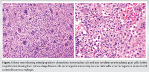 Intraoperative cultures revealed the growth of methicillin-sensitive staphylococcus aureus, sensitive to cefoxitin, gentamicin, cotrimoxazole, and doxycycline. The patient received 2 weeks of intravenous antibiotics followed by 4 weeks of oral antibiotics as per culture sensitivity, experiencing no postoperative wound complications and achieving a satisfactory functional outcome. Histopathology confirmed recurrence of GCTB, exhibiting characteristic multinucleated giant cells and neoplastic mononuclear cells surrounded by bone matrix. The patient was followed at regular intervals for 2 years with no signs of recurrence or infection (Fig. 5).