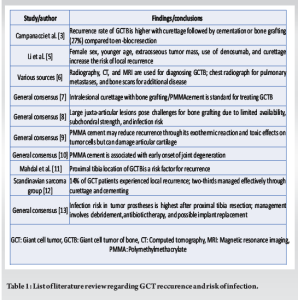 Mahdal et al. in their retrospective study observed that GCTB at proximal tibia location itself was risk factor for recurrence [11]. According to a Scandinavian Sarcoma Group study, 14% of GCT patients experienced at least one local recurrence, with around two-thirds of those cases effectively managed through curettage and cementing [12]. Our case was having the first recurrence of GCTB proximal tibia so we chose extended curettage and cementing with plate stabilization. In our case, the incorporation of antibiotics (vancomycin and gentamycin) with PMMA cement offered an added advantage by delivering a high concentration of local antibiotics to combat infection. Postoperatively, the patient has had a pain-free and acceptable functional range of motion of the knee without any recurrence till 2-year follow-up. Our case was exceedingly rare as no such cases have been reported in available literature as per our knowledge. In medical research concerning infections of tumor prostheses implanted after bone tumor removal, the highest risk of infection leading to limb amputation occurs after resection of bone tumors in the proximal tibia, attributed to the poor condition of soft tissue surrounding the area. Regardless of where the tumor prosthesis is implanted, the approach to managing infections remains largely consistent. Typically, it involves several attempts at debridement (removing infected tissue) along with antibiotic therapy. However, if these measures are unsuccessful, the standard procedure involves removing the infected implant and replacing it with a new one. This replacement can be done in either a one- or two-stage procedure, with the latter showing a decreased risk of failure [13]. Some of the issues that surgeons need to address include multiple surgeries over an extended period, and the patients’ immune system that are weakened due to treatments. Moreover, the extensive exposure of tissues during these surgeries, along with dissection across vascular distributions, adds to the heightened risk of infection (Table 1).