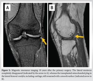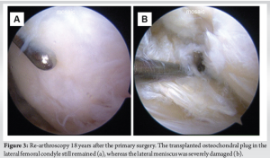 We reported on re-arthroscopic findings of the knee 18 years post-OAT and LM repair. The transplanted osteochondral plug was well integrated, and the cartilage remained; however, the repaired LM was severely damaged. Therefore, it can be concluded that OAT osteochondral plugs remain well for a long time after OAT, and this supports the findings of good clinical outcomes of OAT.
