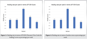 Mean improvement in FIM score from the time of admission till at discharge was calculated to be 42.86% with a standard deviation of 16.84. Healing rate by means of PUSH score was the highest for patient C at 3.57% per week and in terms of surface area for Patient C at 5.44% per week. Healing rate was calculated by using PUSH score and surface area on weekly basis which have been depicted graphically in Fig. 3 and 4.