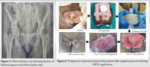 EW conservatively managed case left hemiplegia (Alleged history of head injury due to fall from height) with fracture pelvis with left distal radius fracture with healed Grade IV PI over sacrum with healing Grade II PI on posterior aspect of the left heel. A 46-year-old female patient was managed conservatively at a trauma center. Fig. 5 depicts her pelvis fracture X-ray showing fracture of bilateral superior and inferior pubic rami.