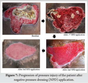 Pressure injury (PI) is defined as “localized damage to skin and underlying soft tissue, usually overlying a bony prominence or caused by contact with a medical device or another object, which develops due to intense and/or prolonged pressure or pressure combined with shearing.” It can present as intact skin or as open ulcers [1]. Despite recent advancements in the treatment of bedridden individuals, PIs continue to remain one of the most common and debilitating complications seen. PIs are mostly non-healing, adding to the financial burden of the patients and caregivers. Hence, economical methods are highly beneficial for the patient and their families. Vacuum-assisted closure (VAC)/negative pressure wound therapy (NPWT) is an alternative method for faster healing of chronic non-healing PIs. It is a wound dressing system that subjects the entire wound to sub-atmospheric pressure. It consists of a semi-occlusive adhesive cover, a system to collect fluid, and a suction pump. It involves application of negative pressure which causes increased tissue pressure and faster flowing of intravascular fluid thereby reducing the intravascular Hydrostatic pressure. This results in decreased edema at the site of the PI. In addition, it forces the edema away from the site of the injured tissues which improves oxygenation of the cells and thus enables faster healing [2]. NPWT impart a negative pressure of −60 to −125 mm Hg over the surface of the ulcer. Suction created enables removal of interstitial fluid, reduces edema, decreasing bacterial levels while increasing blood flow [3]. The available VAC systems are expensive and many affected individuals in developing countries find it difficult to afford. In our case series, we have applied low-cost negative pressure dressing (NPD) for sacral PIs in five patients along with individualized rehabilitation protocol which resulted in accelerated healing of their PIs and improved functional outcome.
