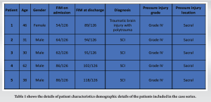 Out of the five patients included, all were of Grade IV according to NPIAP staging. About 75% of the patients were diagnosed with spinal cord injury (SCI) and one patient (25%) with traumatic brain injury due to polytrauma. About 75% of the patients were men and 25% were women. Table 1 shows the details of patient characteristics demographic details of the patients included in the case series. (Fig. 1, 2)