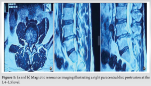 A 44-year-old male presented with severe low back pain radiating to the right lower limb, accompanied by numbness in the foot and toes. The pain, rated 8/10 on the Visual Analog Scale (VAS), had persisted for 6 months, significantly impairing his quality of life, as indicated by an Oswestry Disability Index score of 70%. His symptoms worsened with bending forward and performing daily activities, with notable aggravation over the past month. Physical examination revealed Right Extensor Hallucis Longus weakness with intact deep tendon reflexes. Pre-operative X-rays showed no instability, while magnetic resonance imaging revealed a right paracentral disc protrusion at the L4–L5 level (Fig. 1a and b).