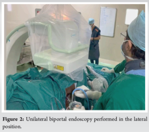 Unilateral biportal endoscopic discectomy in the lateral position is an effective and minimally invasive technique for treating spinal disc pathologies. This approach offers significant advantages, including precise surgical intervention, minimal tissue disruption, reduced operative time, and accelerated recovery. As experience with this technique grows, it holds the potential to become a standard practice in spinal surgery, providing substantial benefits for both patients and surgeons. This method minimizes complications and improves patient outcomes, making it a promising advancement in the field of spinal surgery.