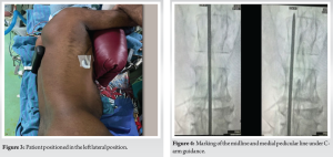 Under general anesthesia, the patient is placed in the left lateral position for a right-sided disc pathology (Fig. 3). Positioning in the right lateral position for right-sided pathology can negatively affect water dynamics and orientation, making it challenging to direct the scope upward. Two bolsters support the patient, and the hip is flexed just short of 90° to bring the spine into a flexed posture, widening the interlaminar area and reducing the amount of bone removal required. Flexing the hip beyond 90° can hinder C-arm imaging. Adequate padding of bony prominences is essential to avoid inadvertent neurovascular issues.