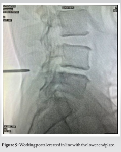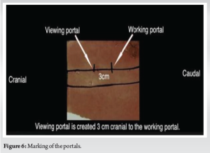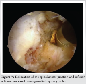 Once the patient is positioned and necessary trial imaging is done, the patient is draped and prepared for the procedure. The lateral position allows the surgeon the flexibility to either stand or sit during the surgery. Under C-arm guidance, midline and medial pedicular lines are marked (Fig. 4). Using a 30° scope, the working portal is made in line with the superior endplate of the lower vertebra (Fig. 5), and the viewing portal is placed 3 cm cranial to the working portal (Fig. 6). Once the portals are created, the working space is established at the spinolaminar junction with the aid of a blunt periosteum, shaver, and radiofrequency ablation (Fig. 7).