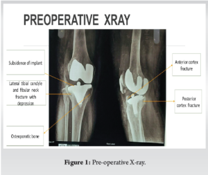 PPFs after TKA are relatively rare but clinically significant. Risk factors include poor bone quality—especially from RA, osteoporosis, long-term corticosteroid use, and advanced age [2-17]. Additional contributors include femoral notching, osteolysis, stiff knees, and stress risers like screw holes. Neurologic conditions (e.g., Parkinson’s, epilepsy, ataxia, cerebral palsy) may also increase fracture risk. Although no definitive link has been established between component malalignment and periprosthetic fractures, tibial varus malalignment may contribute to tibial PPFs [18-25]. In this patient, a Type III PPF was caused by a minor fall. Imaging confirmed fracture of the lateral tibial condyle and anterior/posterior cortices with polyethylene wear and component loosening (Fig. 1–4). Prompt preoperative work-up ruled out infection and allowed timely surgery. The Vancouver system classifies this as complex and necessitating revision (Fig. 6). Surgical management addressed implant replacement, polyethylene wear, and fracture stabilization. Early mobilization and structured rehab (Fig. 6-8) were critical to the patient’s recovery. The patient had a history of RA and methotrexate use, both of which impact bone density and healing. Hence, teriparatide therapy was initiated. At one year, radiological follow-up confirmed stable components and full recovery (Fig. 9 and 10). This case reinforces the importance of infection screening, prosthesis evaluation, and multidisciplinary rehabilitation. As TKA rates rise, so will PPFs, especially in immunosuppressed or osteoporotic populations. Continued improvement in implants, techniques, and post-op care are vital for managing such complex cases.