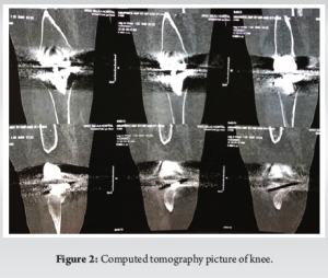 A 52-year-old female with rheumatoid arthritis (RA), who had undergone right total knee replacement 8 years ago, presented to the emergency department after a slip and fall at home, which resulted in difficulty bearing weight. On examination and radiological imaging, a periprosthetic fracture was identified in the right lateral tibial condyle with anterior and posterior cortex involvement (Fig. 1), and further characterized using CT imaging (Fig. 2). Implant loosening was noted, and damage to the polyethylene insert was present. Based on the discussed classification, this was categorized as a Type III PPF.