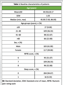 Data from a total of 300 patients was included for analysis. As per the EMRs, tapentadol NS was administered at a dose of 22.5 mg per spray in each nostril (45 mg/dose) every 4–6 h for a period of 3 consecutive days. Among the patients, 183/300 (61.00%) were male and 117/300 (39.00%) were female. The mean ± SD age of patients was 44.93 ± 18.17 years and the median age was 45 years; the mode value of age was 60 years. The majority (36.33%) of the patients were between 21 and 40 years old. The pain score at baseline (on NPRS) ranged between 6 and 8, with most patients (36.33%) having a score of 7. Most patients (94.67%) did not have sleep difficulty at baseline (Table 1). Lumbar canal stenosis was the most commonly-detected cause of LBP, being diagnosed in 85 (28.3%) patients.