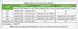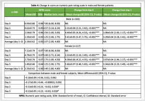 Both male and female patients showed significant reduction in pain intensity or NPRS score from day 0 or day 1 to subsequent days (P < 0.001 for all) (Table 4). From day 0 to day 3, pain intensity was reduced by 80.81% in male patients and 79.61% in female patients.
