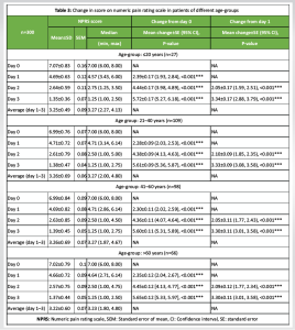 Analysis of patients from different age groups showed that pain intensity or NPRS score reduced significantly from day 0 or day 1 to subsequent days in all age-groups (P < 0.001 for all). The percentage of reduction in pain intensity was comparable among the age-groups (≤20 years: 80.91%; 21–40 years: 80.26%; 41–60 years: 80.11%; >60 years: 80.48%) (Table 3).